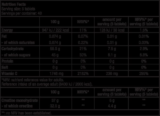 КРЕАТИН МОНОГИДРАТ В ЖЕВАТЕЛЬНЫХ ТАБЛЕТКАХ С ФРУКТОВЫМ ВКУСОМ, ОБОГАЩЁННЫЙ ВИТАМИНОМ C.