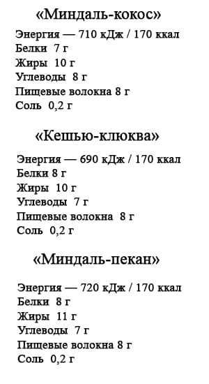- Состав: миндаль; пекан; изомальтоолигосахариды (пребиотик); растворимое кукурузное волокно; изюм; масло какао; подсластитель изомальт; крупа рисовая; молоко сухое; белок гороховый; какао-порошок; соль розовая гималайская; эмульгатор лецитин соевый.